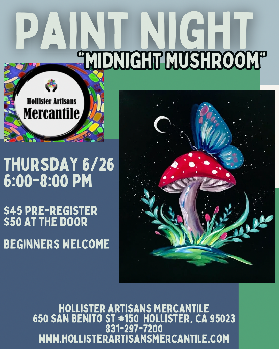 Unleash your creativity and join us for a fun and relaxing Paint Night at The Merc! On June 26th from 6 PM to 8 PM, we’ll be painting a colorful midnight mushroom. We will guide you step-by-step, so whether you’re a seasoned artist or just looking for a fun night out, you’ll leave with a piece you’re proud of. Grab your friends, sip on your favorite drink, and enjoy a night filled with laughter, color, and creativity.