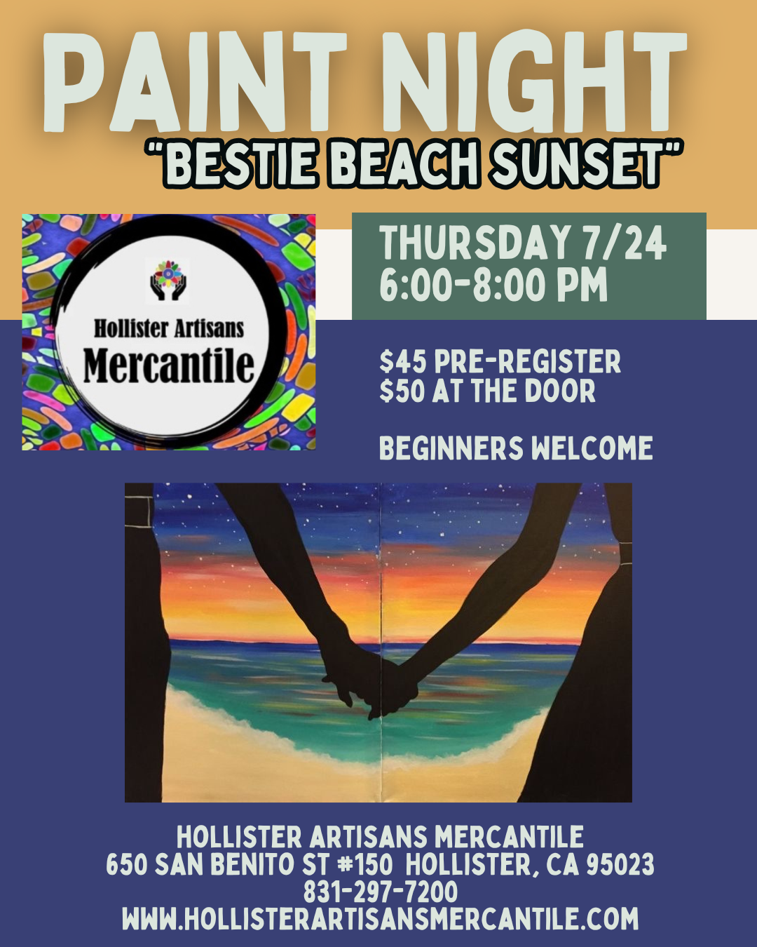 Grab your favorite bestie and unleash your creativity to join us for a fun and relaxing Paint Night at The Merc! On July 24th from 6 PM to 8 PM, we’ll be painting a beautiful beach sunset, the perfect summer time piece to brighten up your home.
